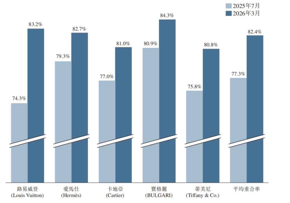 从下图可以看到,老铺和LV、爱马仕、卡地亚、宝格丽等五大奢侈品品牌消费者重合度从上半年77.4%进一步提升至82.4%,说明老铺仍在从奢侈品品牌中抢占市场份额。