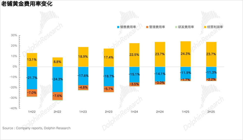 销售费用上,一方面伴随老铺品牌力的提升,海豚君推测老铺进驻高端商场的租金成本有所下滑,另一方面,再叠加线上渠道占比大幅提升(线上无需支付租金营销费用更低),二者共同使得销售费用率下滑2.8pct达到11.3%。