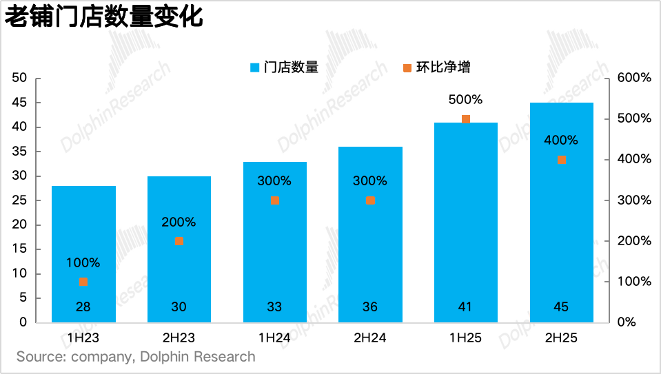 开店节奏上,下半年老铺净新增4家门店,全部位于上海最顶级的重奢商场,截至2025年底,老铺共有45家门店,基本完成了国内第一梯队的重奢和前十大高奢商场的全覆盖。